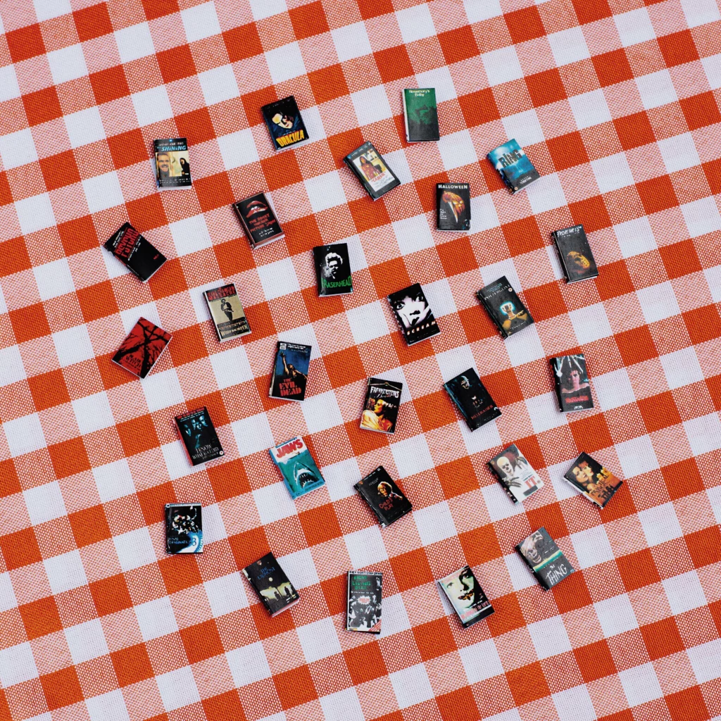Miniatura de estante de filmes em cerâmica fria envernizada com verniz vitral, 10,5cm de altura, contendo 29 mini VHS de filmes de terror em papel couchê e espuma preta, 1,5cm. Os títulos são: Rosemary's Baby, Jaws, Psycho, Blair Witch, The Exorcist, The Rocky Horror Picture Show, Texas Chainsaw Massacre, Child's Play, Friday the 13th, Scream, The Ring, I know what you did last summer, Nightmare on Elm Street, Bride of Frankenstein, It, Night of the living dead, Final Destination 3, Poltergeist, The Shining, Practical Magic, Silence of the Lambs, Dracula, Halloween, Eraserhead, Carrie, The Thing, Evil Dead, Hellraiser, Blair Witch (2016).